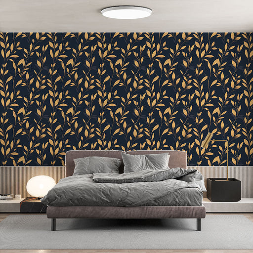 WonderMuralΑυτό το ταπετσαρία διαθέτει ένα εξαιρετικό μοτίβο από χρυσά φύλλα σε μεσάνυχτα μπλε φόντο, δημιουργώντας ένα εντυπωσιακό και κομψό αντίθεση. Τα λεπ...