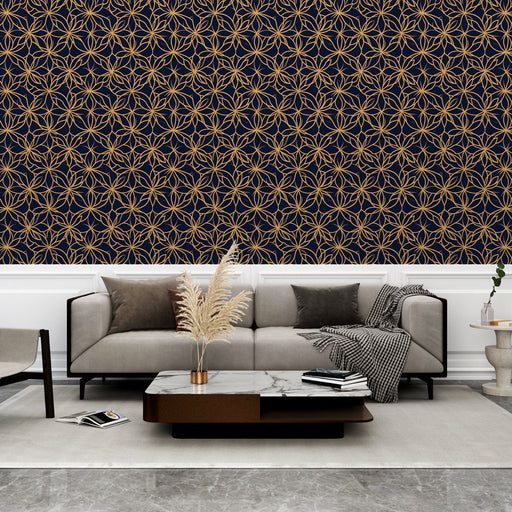 WonderMuralΑυτό το ταπετσαρία διαθέτει ένα όμορφο μοτίβο στιλιζαρισμένων λουλουδιών σε μπλε ναυτικό και χρυσό, προσφέροντας έναν κομψό και σύγχρονο χαρακτήρα....