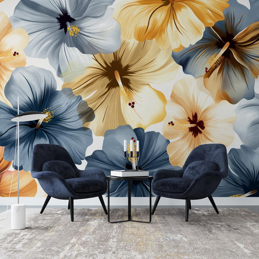 WonderMuralΑυτή η ζωντανή ταπετσαρία τοίχου διαθέτει μεγάλα άνθη ιβίσκου σε μπλε-γκρι και χρυσές αποχρώσεις σε λευκό φόντο, δημιουργώντας μια εντυπωσιακή και ...