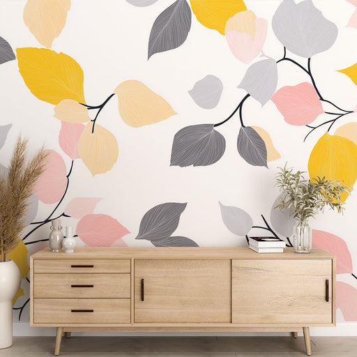 Προβολή πλήρων λεπτομερειώνΤαπετσαρία τοιχογραφίας παστέλ φύλλωμα | Απαλά φύλλα σε ροζ, κίτρινο και γκρι