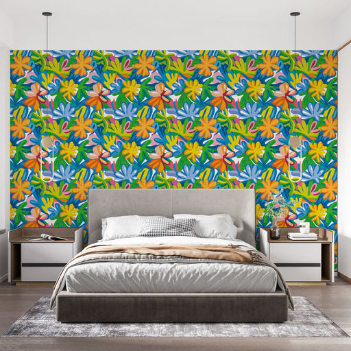 WonderMuralΑυτό το ζωηρό ταπετσαρία διαθέτει ένα όμορφο μοτίβο από πολύχρωμα λουλούδια σε αποχρώσεις του κόκκινου, μπλε και πορτοκαλί, αναμειγνύοντας με αφήσε...