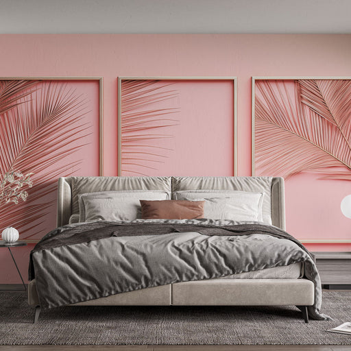 WonderMuralΑνακαλύψτε το κομψό μας Ταπετσαρία τοίχου που παρουσιάζει στιλιζαρισμένα φύλλα φοίνικα, παρουσιασμένα σε αποχρώσεις ροζ και χρυσού. Κάθε πάνελ προσ...