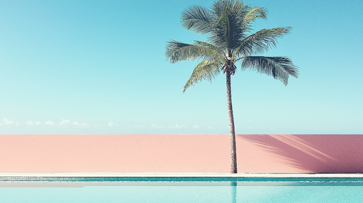 Προβολή πλήρων λεπτομερειώνPapel pintado palmera junto a la piscina | Una escena relajante con tonos suaves de azul y rosa