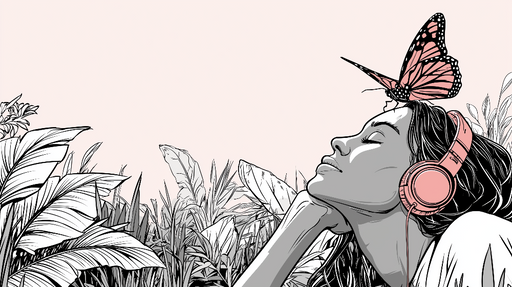 Προβολή πλήρων λεπτομερειώνPapel pintado mujer y mariposa | Retrato minimalista de una mujer con auriculares y una mariposa en la cabeza