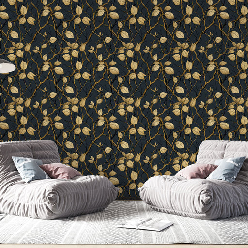 WonderMuralΤο αποκλειστικό μας Ταπετσαρία τοίχου παρουσιάζει ένα κομψό μοτίβο από χρυσά φύλλα που πλέκονται σε κλαδιά σε ένα βαθύ μαύρο υπόβαθρο. Η συνδυασμέν...
