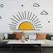 Αυτό το ταπετσαρία τοιχωμάτων αντιπροσωπεύει ένα στιλιζαρισμένο ηλιοβασίλεμα, με ένα φωτεινό κίτρινο ήλιο που αναδύεται από τον ορίζοντα. Οι ακτίνες του ήλιου εκτείνονται προς τα επάνω, δημιουργώντας ένα δυναμικό και ζεστό αποτέλεσμα. Τα σύννεφα που απεικονίζονται με μαύρες περιγραφές προσθέτουν μια παιχνιδιάρικη και ελαφριά πινελιά.