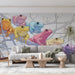 Αυτό το ταπετσαρία τοίχου παρουσιάζει ένα συναρπαστικό σχέδιο με πολύχρωμα βατράχια σε φωτεινές αποχρώσεις - πορτοκαλί, κίτρινο, μπλε, ροζ και μωβ - που ξαπλώνουν σε ένα λεπτό κλαδί που πλέκεται με φύλλα. Η στιλιζαρισμένη εικονογράφηση συνδυάζει καθαρές γραμμές και ρευστά σχήματα, δημιουργώντας μια χαρούμενη και καταπραϋντική ατμόσφαιρα.