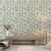 Τα χρώματα που ταιριάζουν με αυτή την ταπετσαρία περιλαμβάνουν φυσικούς τόνους όπως το λευκό, το ανοιχτό γκρι, και ξύλινα στοιχεία, τα οποία θα αναδείξουν την ομορφιά του μοτίβου διατηρώντας την αρμονία στον χώρο. Η προσθήκη αξεσουάρ σε σκούρο πράσινο θα ενισχύσει αυτή τη φυσική και γαλήνια ατμόσφαιρα.