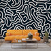 Αυτή η ταπετσαρία τοίχου διαθέτει ένα οργανικό μοτίβο με ακανόνιστες λευκές γραμμές που περιπλέκονται σε ένα βαθύ μαύρο φόντο. Η εντυπωσιακή αντίθεση μεταξύ του σκούρου φόντου και των κυματοειδών γραμμών δημιουργεί ένα δυναμικό, σχεδόν υπνωτιστικό οπτικό αποτέλεσμα, που θυμίζει φυσικούς λαβύρινθους ή αφηρημένες γεωμετρικές χαράξεις.