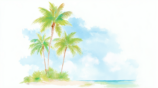 WonderMuralEste elegante papel pintado mural ilustra exuberantes palmeras en acuarela, de pie en una playa bañada en luz. El fondo de cielo azul y suaves nube...