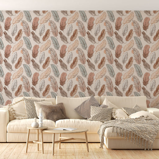 WonderMuralNuestro Papel pintado ofrece un hermoso patrón de plumas en tonos cálidos, que van desde el rosa suave hasta el beige, sobre un fondo claro, creand...