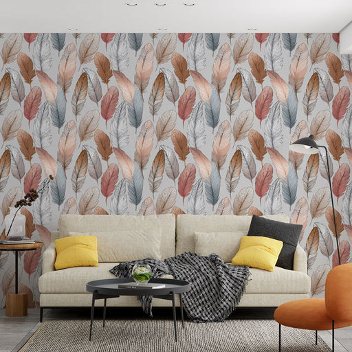 WonderMuralNuestro papel pintado mural presenta un elegante motivo de coloridas plumas, que van desde tonos coral hasta tonos más neutros, sobre un fondo crem...