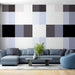 Este papel pintado mural se destaca por su diseño geométrico limpio, donde bloques de colores negro, blanco y gris se intersectan para crear un patrón equilibrado y moderno. Los cuadrados y rectángulos se entrelazan, añadiendo un toque contemporáneo a cualquier habitación. Las sutiles tonalidades de gris y azul claro suavizan el conjunto manteniendo una estética minimalista.
