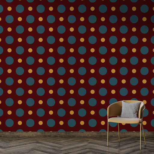 Studio SamaEste papel pintado retro presenta patrones de lunares azules y dorados sobre un fondo granate rico, aportando un toque elegante y vibrante a la dec...