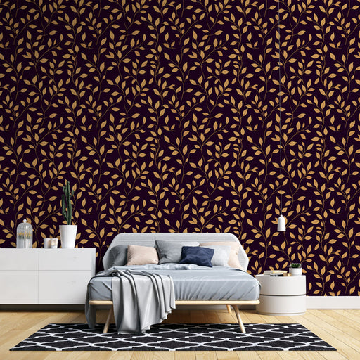 Ver todos los detallesPapel pintado de follaje | Diseño elegante de hojas doradas sobre un fondo burdeos