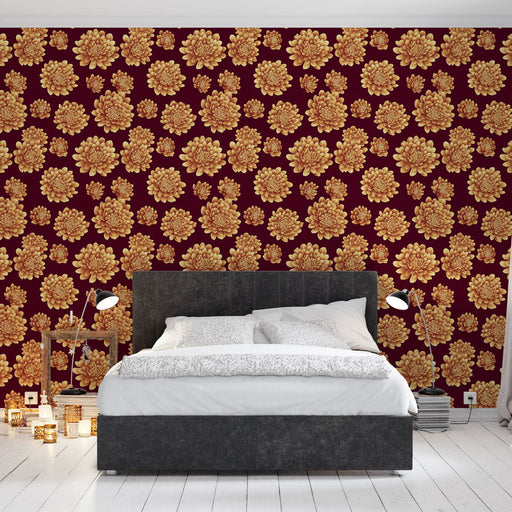 WonderMuralNuestro papel pintado mural presenta un hermoso patrón de crisantemos dorados sobre un fondo burdeos intenso, creando un ambiente cálido y acogedor...