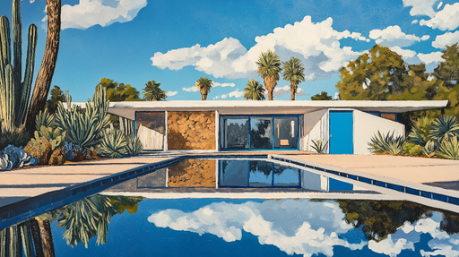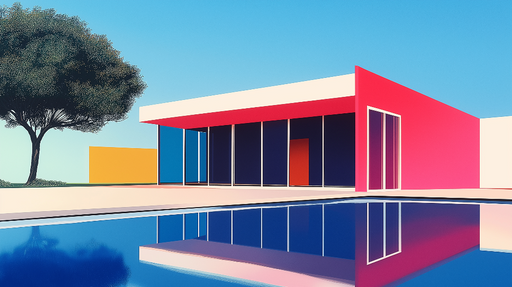 WonderMuralNuestro Papel pintado ilustra una casa moderna con líneas limpias y colores brillantes, con un juego de reflejos en una piscina abajo. Los tonos ro...