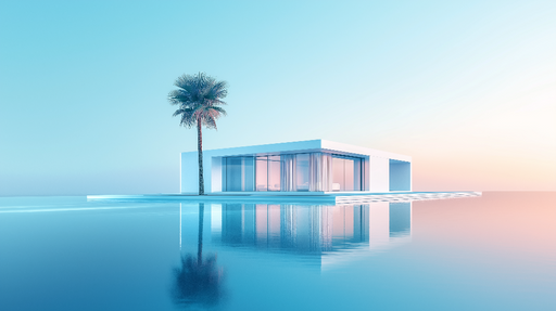 WonderMuralNuestro exclusivo papel pintado mural presenta una casa moderna situada en una plataforma de agua tranquila, bajo un cielo azul brillante. El diseñ...