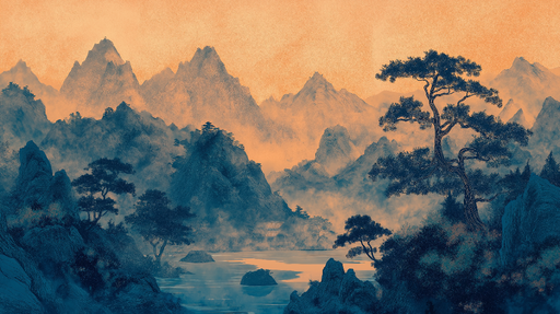 Ver todos los detallesPapel pintado paisaje oriental | Montañas majestuosas y cascadas bajo un cielo ardiente