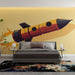 Este dinámico papel pintado mural presenta un cohete retro en pleno vuelo, impulsado por una llama vibrante y tonos cálidos. El contraste entre el fondo amarillo dorado y los detalles naranjas y negros del cohete da una impresión de movimiento y energía.