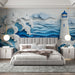 Papel pintado faro | Olas en papel recortado y faro azul
