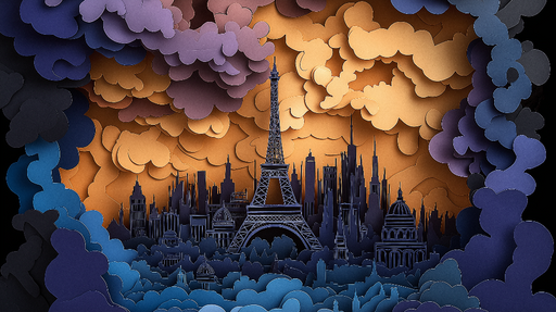 Papel pintado Timeless Paris | Silueta de la Torre Eiffel sobre un paisaje colorido en papel cortado