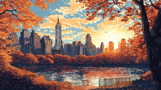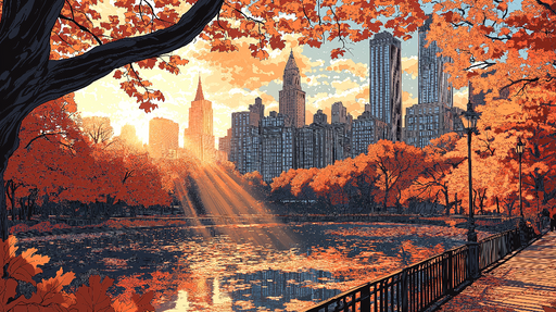 Ver todos los detallesPapel pintado Nueva York | Parque con follaje naranja y paisaje urbano