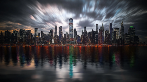 WonderMuralEste papel pintado mural presenta una impresionante vista del horizonte de Nueva York, capturada bajo un cielo nublado coloreado por los reflejos d...