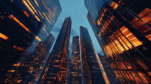 WonderMuralEste papel pintado mural captura una ciudad moderna a través de una impresionante perspectiva, con relucientes rascacielos bajo un cielo crepuscula...