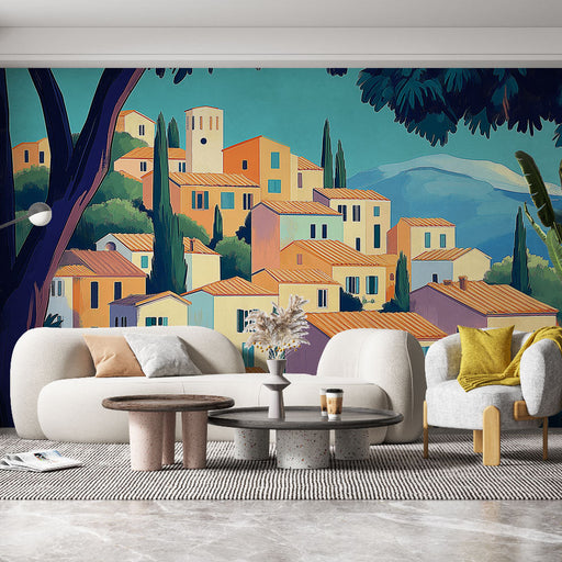 WonderMuralEste papel pintado mural evoca un animado paisaje provenzal, con casas de fachadas de colores pastel y techos de tejas rojas, rodeadas por una natu...