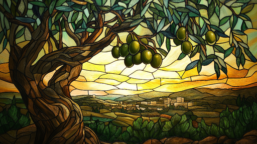 WonderMuralEste magnífico papel pintado muestra un majestuoso olivo, con sus brillantes hojas verdes y frutos representados en un estilo inspirado en el vidri...