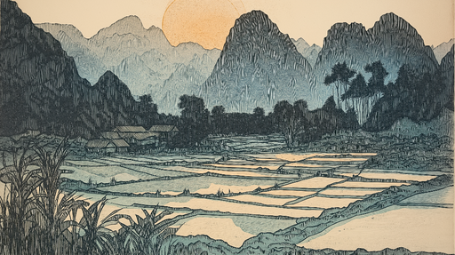 Ver todos los detallesPapel pintado paisaje de montaña | Escena serena con campos de arroz y montañas al fondo