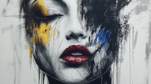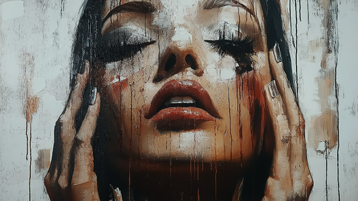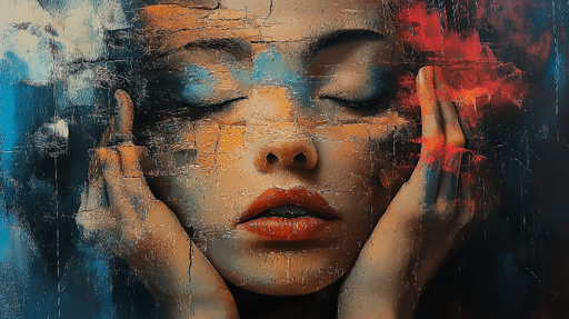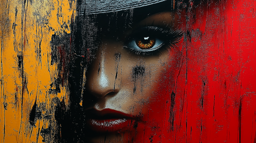 WonderMuralEste cautivador papel pintado mural muestra un dramático retrato femenino, donde los tonos ricos y las texturas audaces resaltan emociones intensas...