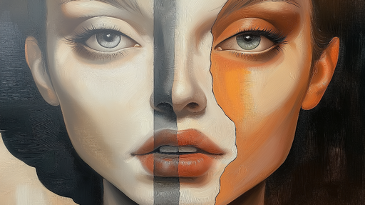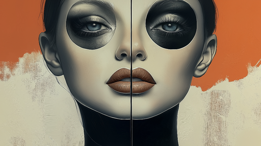 WonderMuralEste cautivador papel pintado mural presenta un rostro dividido en dos, utilizando tonos contrastantes de beige, negro y naranja. Cada mitad ilustr...