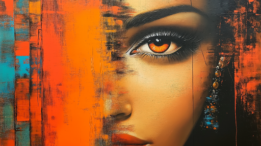 Ver todos los detallesPapel pintado rostro artístico | Retrato estilizado con ojos brillantes y texturas vibrantes
