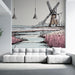 Este papel pintado es una hermosa representación de un paisaje rural, con un molino de viento en medio de campos de flores y un arroyo tranquilo. Los toques rosados y azules crean una atmósfera suave y romántica, perfecta para llevar una sensación de serenidad a su interior.