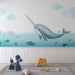 Papel pintado narval | Un adorable narval nadando entre nubes ligeras y barcos de papel
