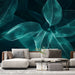 Descubre nuestro papel pintado con un patrón de hojas azul verdoso, que ofrece una presentación elegante y ligera. Estas hojas, representadas con un delicado efecto translúcido, parecen flotar sobre un fondo oscuro, creando una atmósfera moderna y relajante.