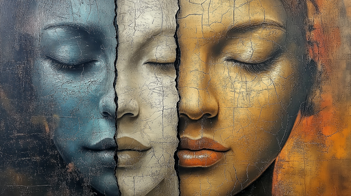 WonderMuralEste cautivador papel pintado mural destaca fascinantes retratos, representando rostros en varios tonos: azul, gris y naranja. Las texturas agrieta...