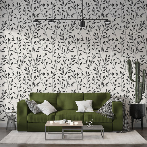 Ver todos los detallesPapel pintado de follaje delicado | Patrón de ramas verdes y negras sobre un fondo claro
