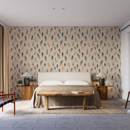 WonderMuralEste papel pintado presenta un patrón refinado de hojas estilizadas en tonos de gris y naranja sobre un delicado fondo beige. Cada hoja está cuidad...