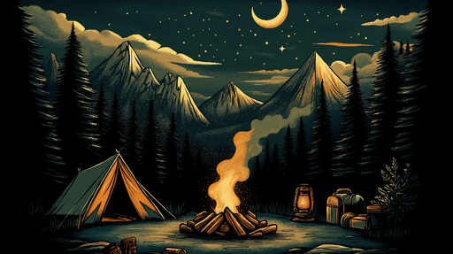 Ver todos los detallesPapel pintado camping | Montañas bajo la luna iluminando un campamento