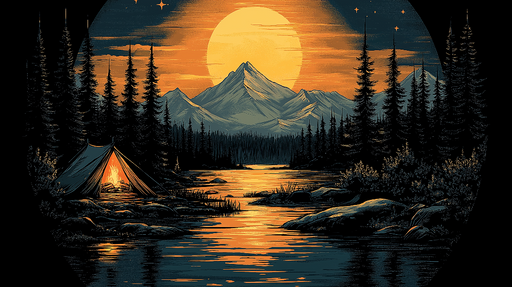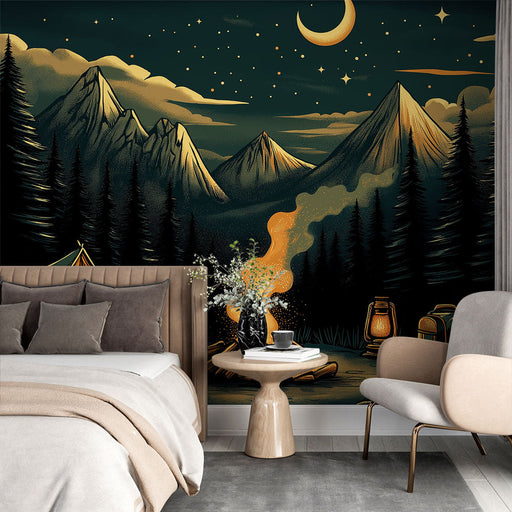 WonderMuralDescubre nuestro cautivador papel pintado que representa un paisaje de campamento nocturno, donde majestuosas montañas se alzan bajo el resplandor ...