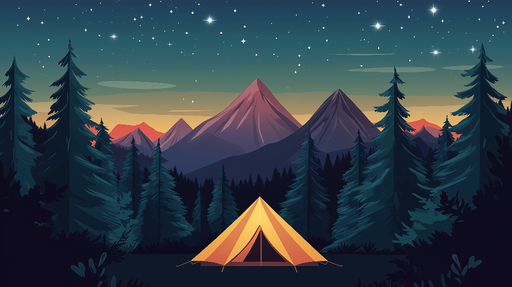 WonderMuralDescubre nuestro cautivador papel pintado con un paisaje de montañas impresionantes envueltas en coníferas oscuras, acentuado por una tienda brilla...