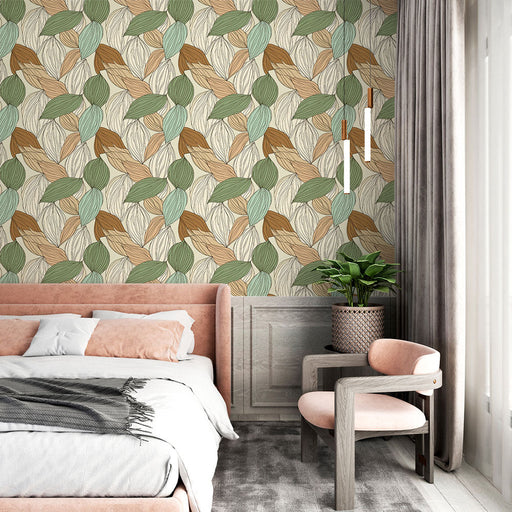 WonderMuralNuestro papel pintado mural premium presenta un patrón de hojas estilizadas en una gama de tonos naturales, desde el relajante verde hasta el cálid...