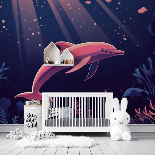 WonderMuralDescubre nuestro cautivador papel pintado que presenta un delfín rosa nadando graciosamente en aguas profundas, iluminado por rayos de luz. El cont...