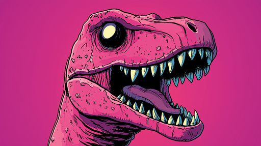 WonderMuralDescubre nuestro vibrante papel pintado mural con la cabeza de un T-Rex en tonos rosa brillante, estilizado con toques de colores para un efecto ar...