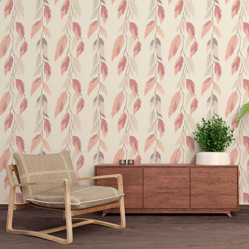Ver todos los detallesPapel pintado de hojas delicadas | Patrón de hojas rosas y crema sobre un fondo claro