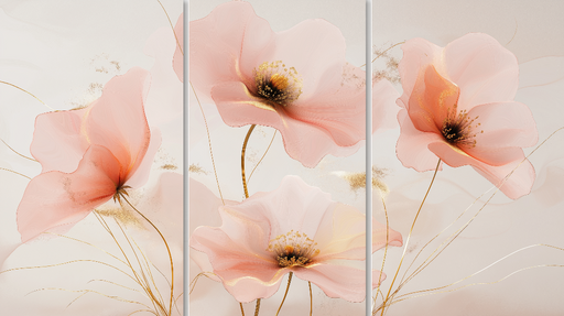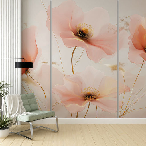 Ver todos los detallesPapel pintado delicadas flores | Pétalos rosados y dorados sobre un fondo suave