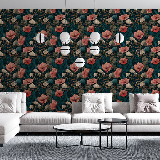 WonderMuralNuestro exclusivo papel pintado mural muestra un hermoso patrón floral en cálidos rosas y beiges sobre un fondo negro, ofreciendo una atmósfera que...